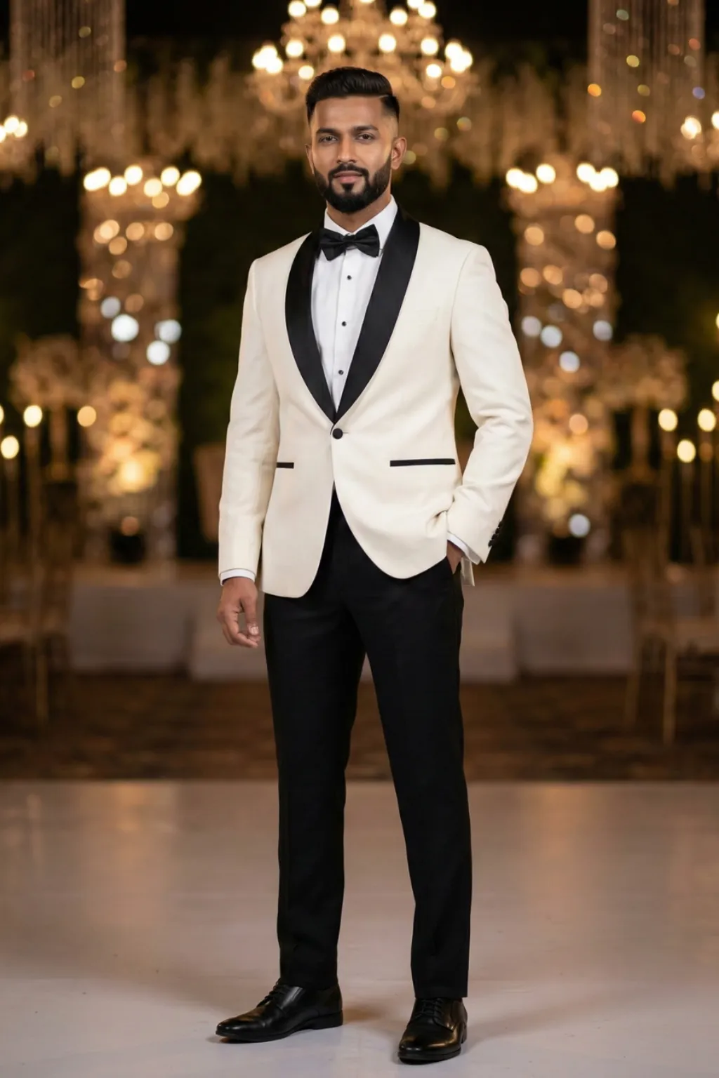 Classic ivory jacket with satin lapels for a sharp, statement entrance.