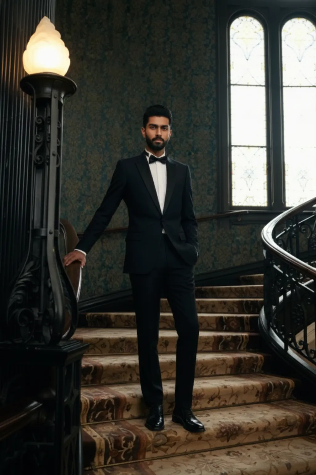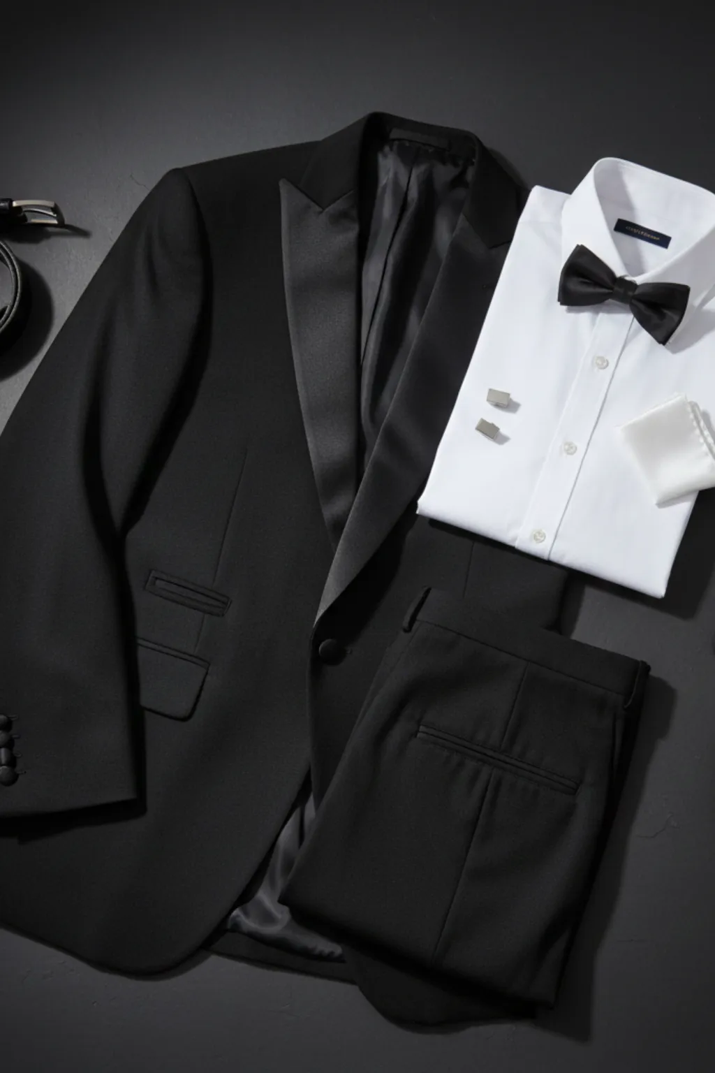 Sharp black tailoring with timeless elegance for formal evenings.